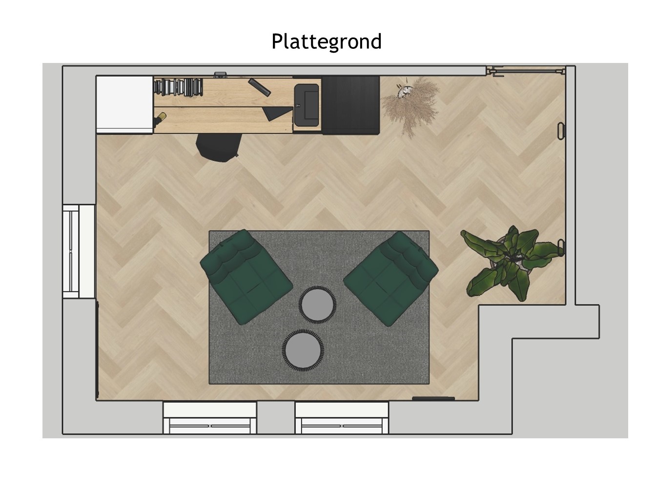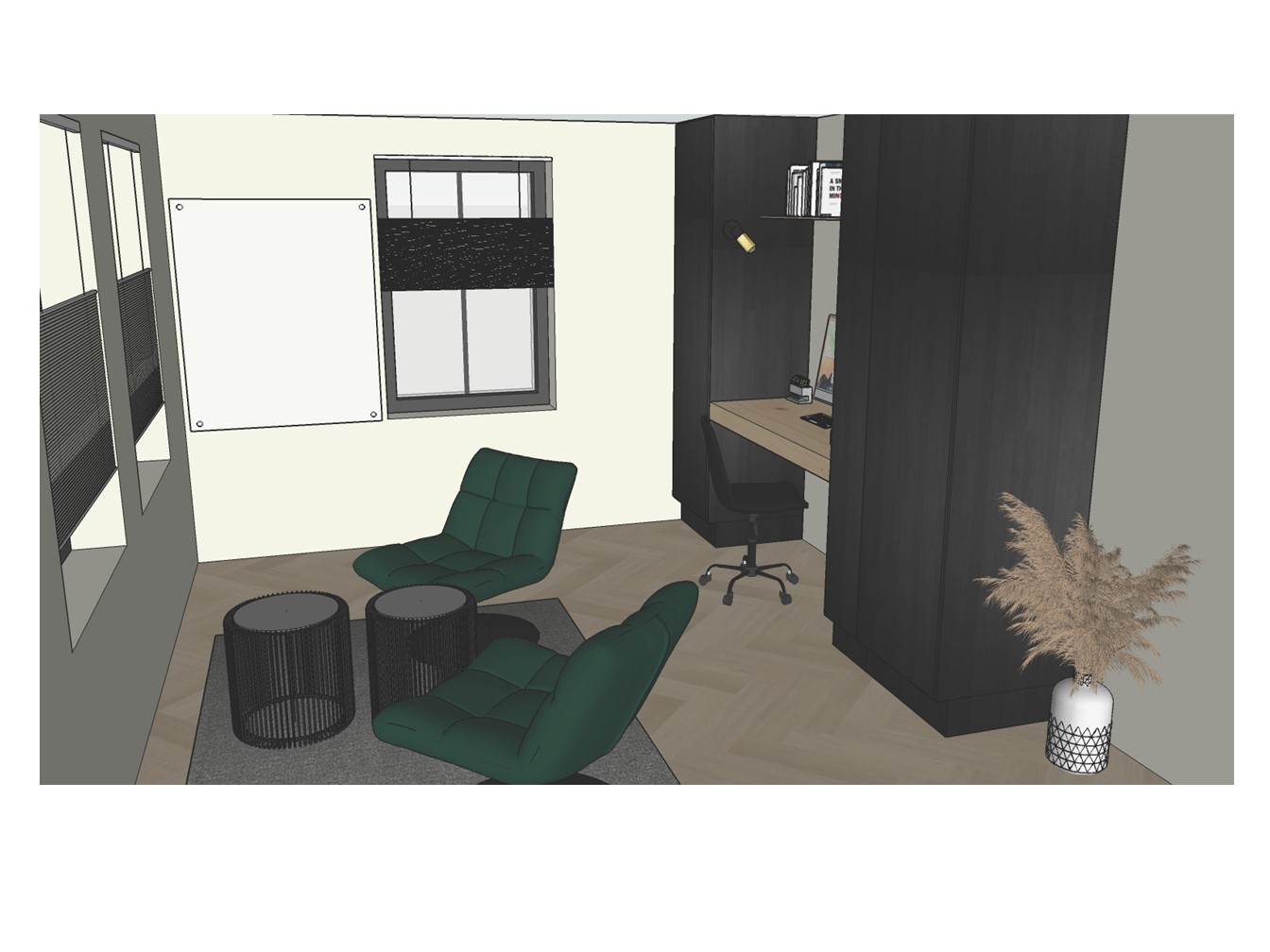 Naast de coach setting is er ook een werkplek gecreëerd om de administratie te verzorgen. Door beide functies met de ruggen tegen elkaar te zetten, worden deze van elkaar gescheiden. Het vloerkleed kadert als het ware de coach setting.