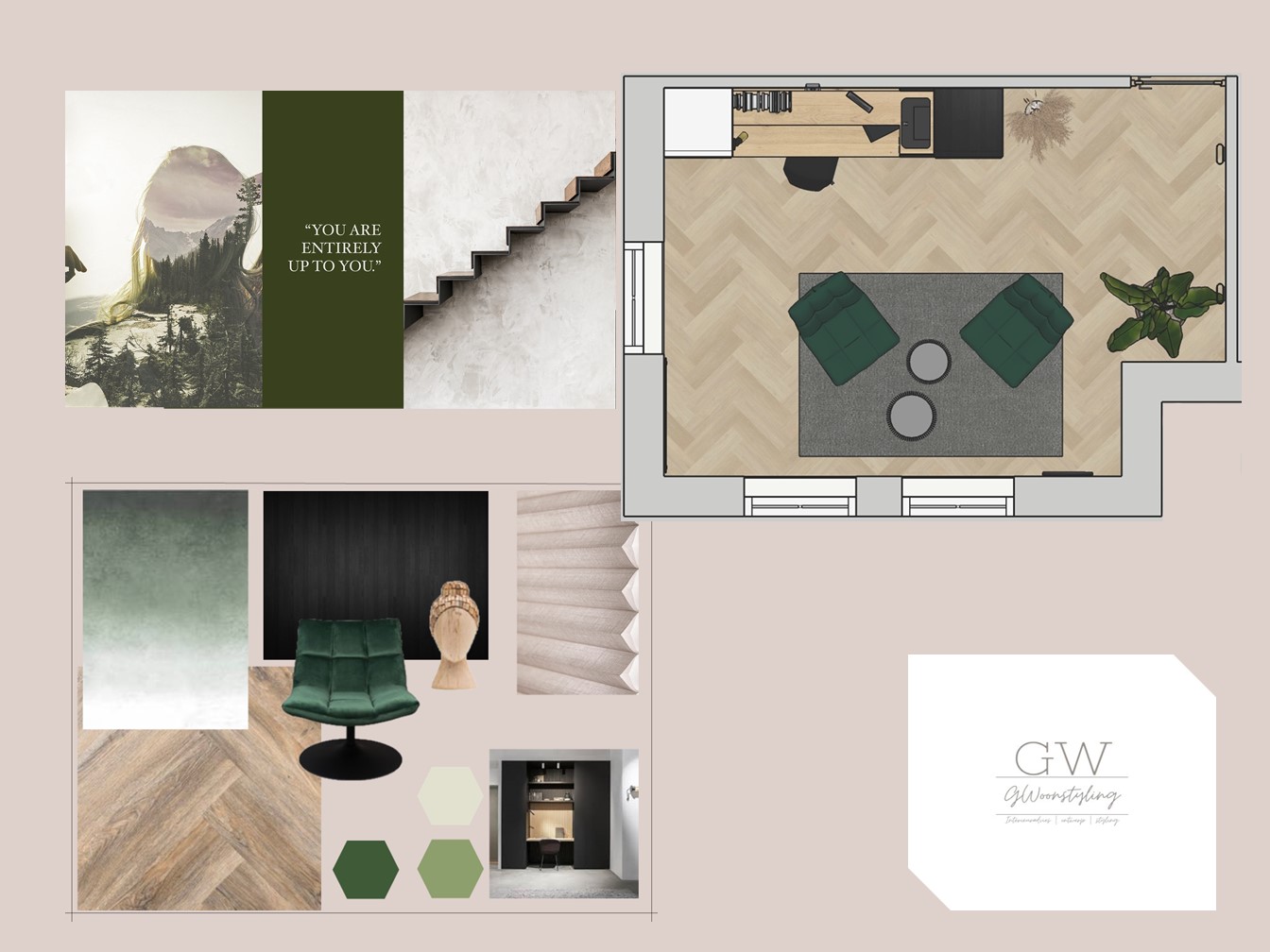 Een compleet interieuradvies voor een coaching praktijk aan huis. Ondanks de informele sfeer waarin cliënten ontvangen worden door de jonge, zelfstandig werkend coach, dient de praktijk wel een professionele uitstraling te hebben.